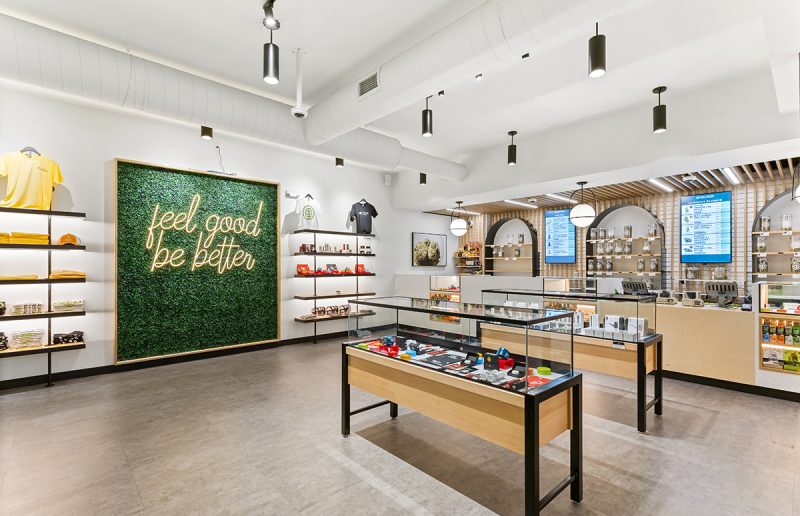 Design elements such as wood slat ceilings, geometric patterned flooring, integrated lighting, and plant-inspired accent walls bring warmth and identity to the retail experience. Signature green brand elements, including custom murals and neon signage, reinforce consistency across locations while enhancing the feel-good brand narrative. Oculus provided full architectural and interior design services from concept through construction, ensuring functional flow, compliance with regulatory requirements, and a flexible framework for future growth.